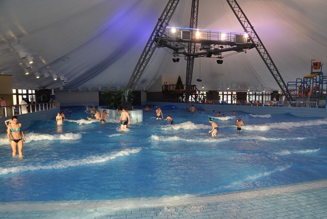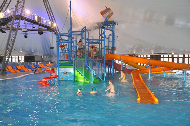 bazén s umelým vlnobitím.Všetky deti si užijú zábavu v novom detskom atrakčnom bazéne s vodnými atrakciami, šmýkačkami, mini-toboganmi, vodnými delami a striekačkami...
